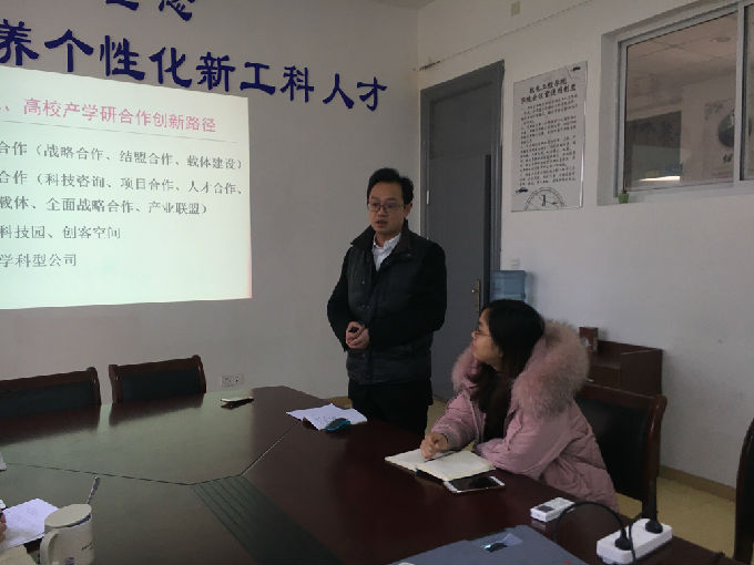 为提高教师产学研合作创新能力,落实学校科研服务社会发展的目标,2019年1月17日上午,在机电工程学院会议室举行科研能力培训系列会议,邀请具有多项出色产学研合作成果的丁劲峰博士作主题为“如何开展产学研合作创新”的报告,机电工程学院院长袁惠新、副院长刘国栋、教学副院长杨敏和全体专业老师参加了此次会议。