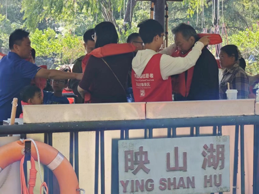 服务过程中,志愿者们各司其职。热闹非凡的古镇表演中,他们耳听六路,眼观八方,时刻关注游客安全,引导人群有序观看。风景如画的古镇建筑下,回荡着志愿者们热情的介绍言语和游客络绎不绝的赞叹声。微风习习的映山湖旁,倒映着志愿者们为远道而来的客人正确穿戴救生衣的忙碌身影。他们所到之处无不充斥着欢声笑语,悠久的古镇文化和热情饱满的待客礼仪在这些时刻充分展现。